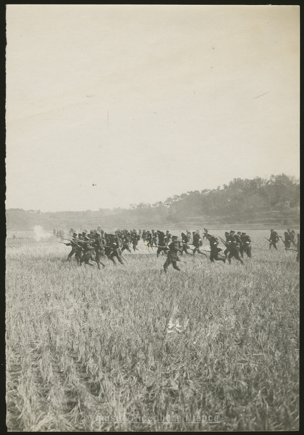 Groupe de soldats chinois tirant au fusil dans un champ