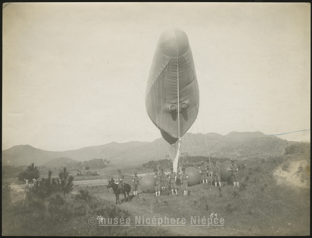 Militaires chinois tenant les cordes d'un aérostat