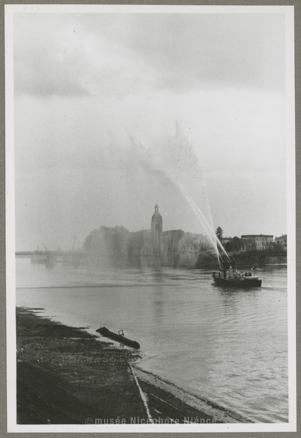 Essais du bateau-pompe "Pythéas", construit par les "Ateliers et Chantiers Navals de Chalon, et destiné au port de Marseille 4 Mars 1952