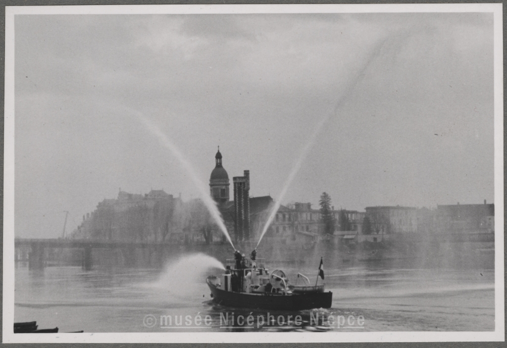 Essais du bateau-pompe "Pythéas", construit par les "Ateliers et Chantiers Navals de Chalon, et destiné au port de Marseille 4 Mars 1952