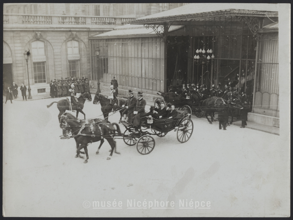 La première journée du nouveau Président de la République / Mr Poincaré quitte le Palais de l'Elysée avec le Président / Fallières, pour l'Hotel de Ville