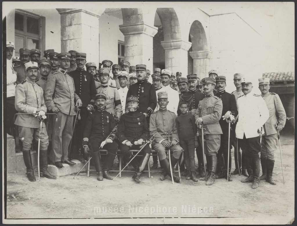 Avant le départ de la mission militaire / française en grèce, les officiers / grecs manifestent le désir de / se faire photographier en compagnie / de leurs amis français