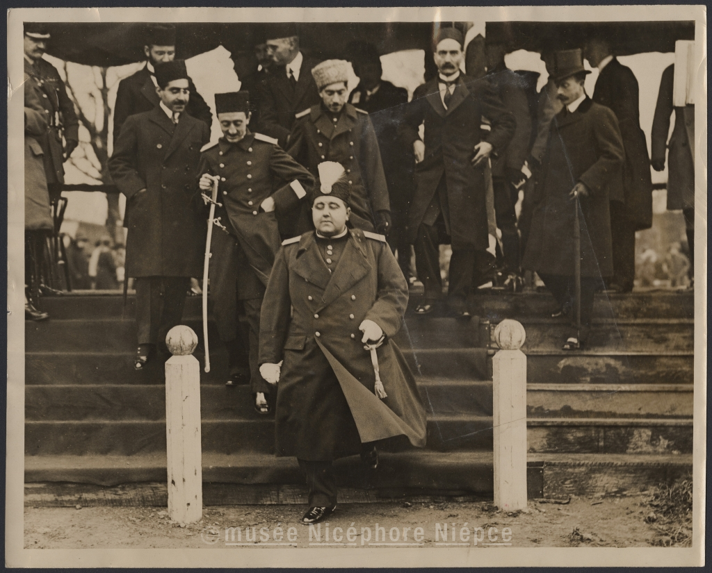 Le shah de Perse quitte la Tribune officielle / après la revue du Camp d'Adelshot