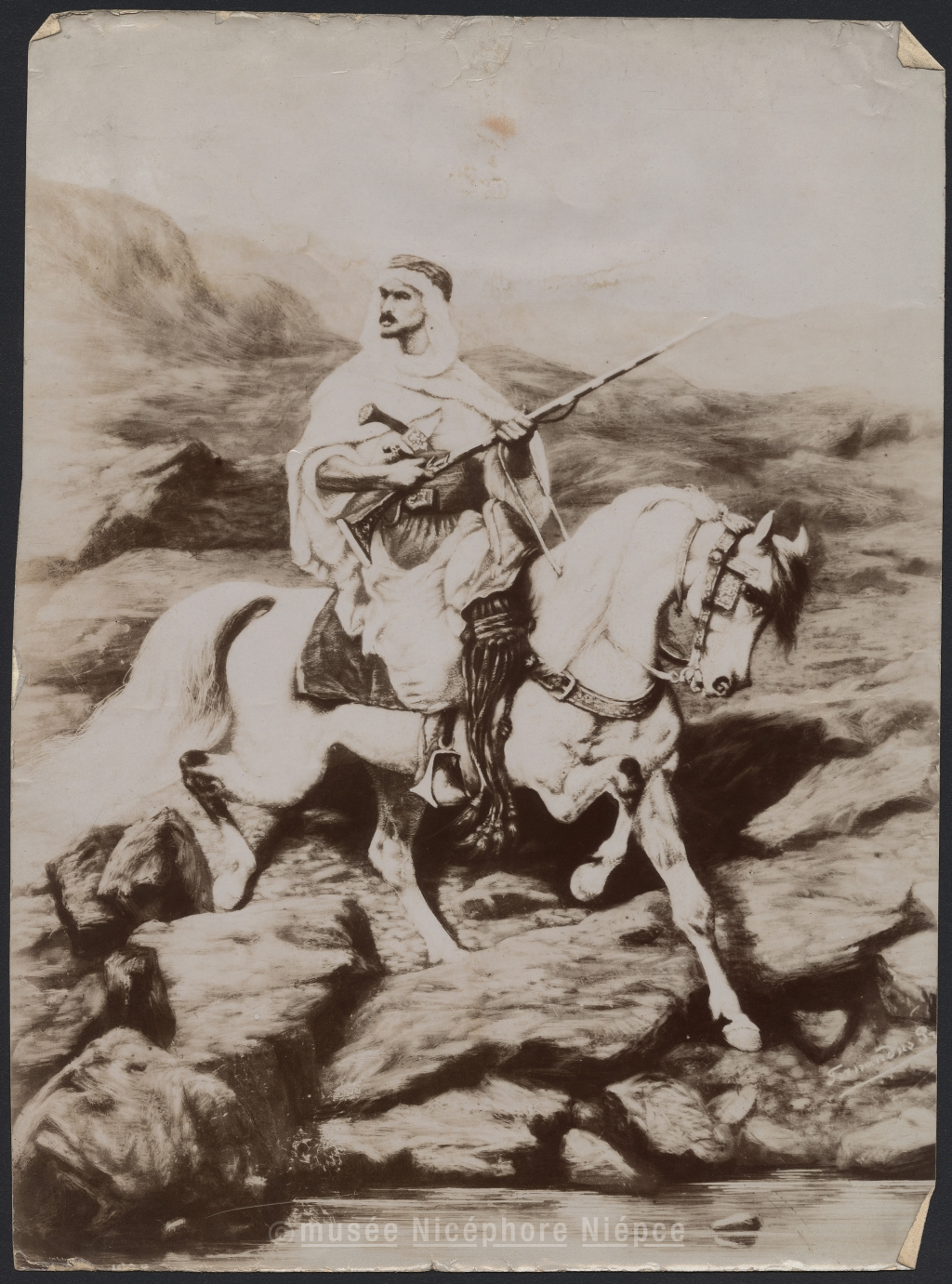 Photographie d'un tableau représentant un guerrier Marocain à cheval (Abd El Krim ?)