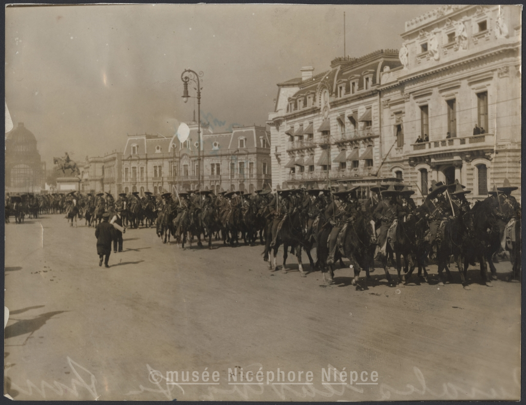 Mounted Rurales passing through the streets of Mexico city on way to station to board troop train for south