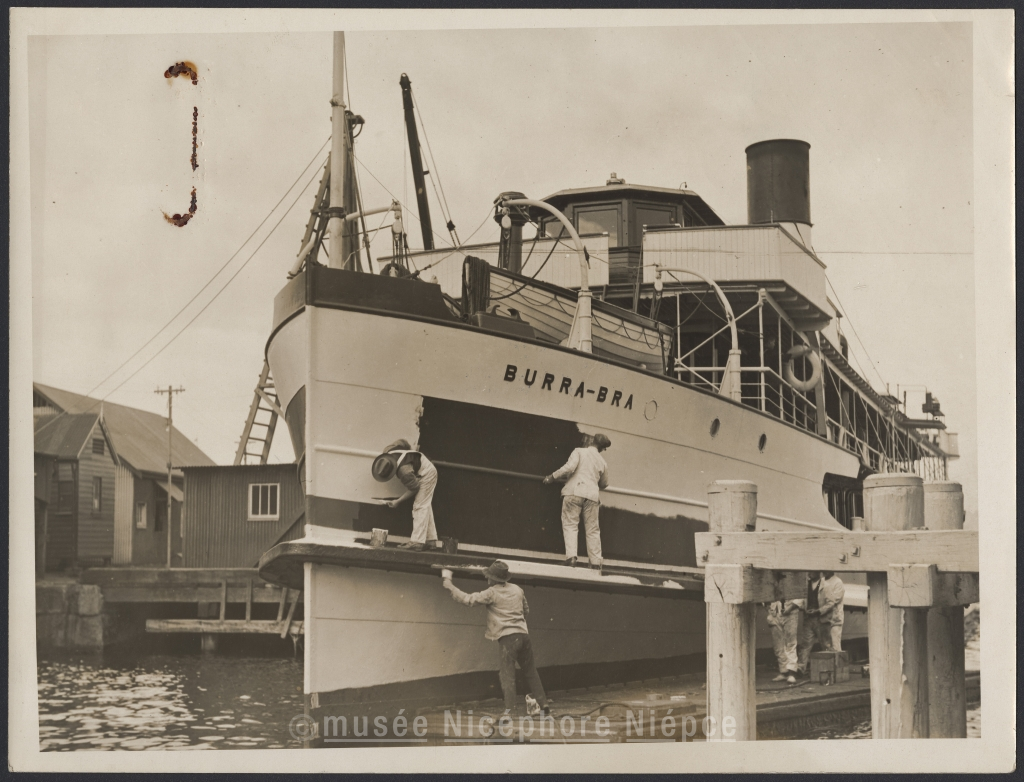 Ouvriers peignant la coque de l'un des bateaux devant servir lors de la clôture du Congrès eucharistique de Sydney