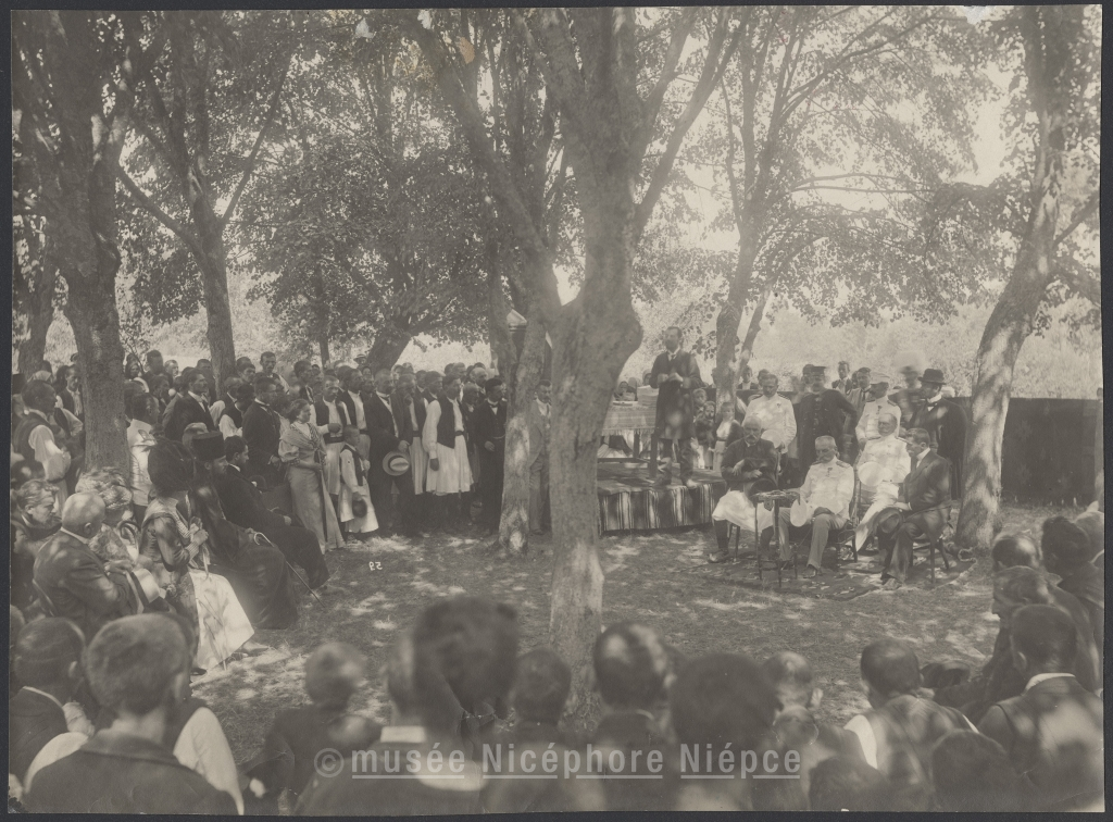 Le roi Pierre ier de Serbie assis face à la foule