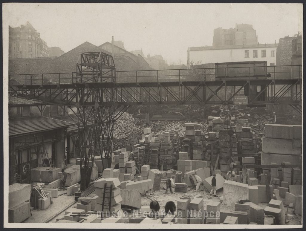 Comment on construit en France / un chantier de sciage de pierres de taille, où les blocs sont façonnés et dirigés sur le / chantier de construction prêts à poser