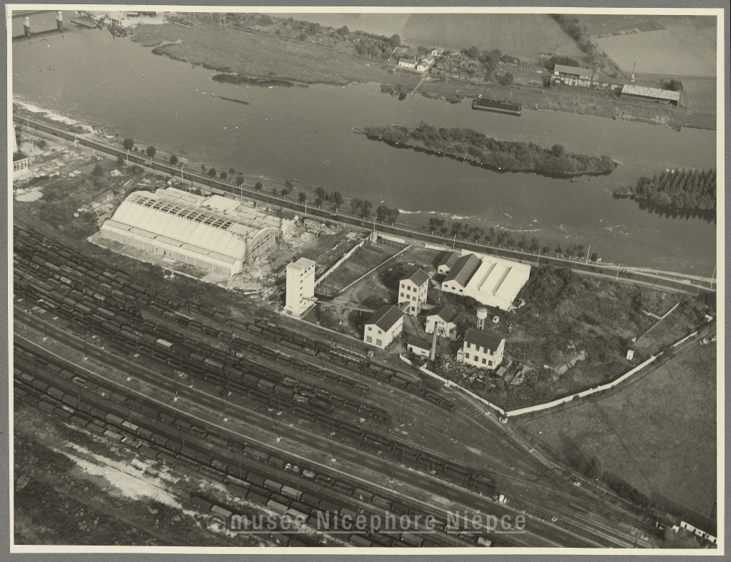 Chalon vu des airs la gare de triage SNCF, la nouvelle usine Gardy, l'huilerie Mamessier 3 octobre 1953