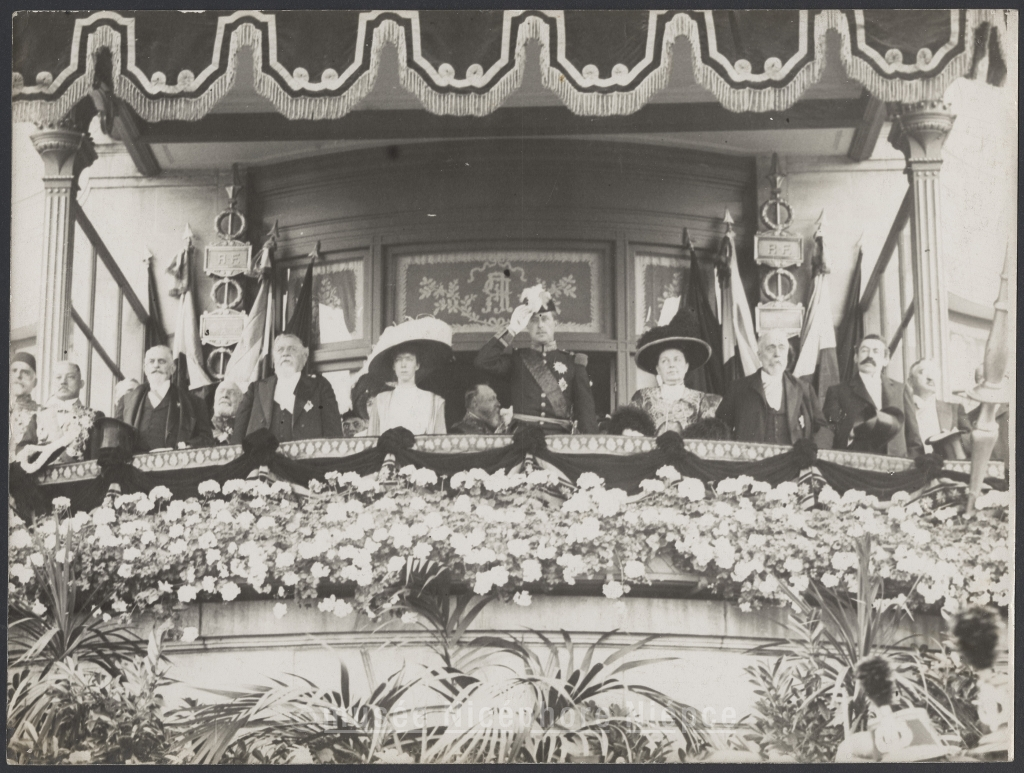 Les souverains belges à la revue de Longchamp. La tribune royale et présidentielle