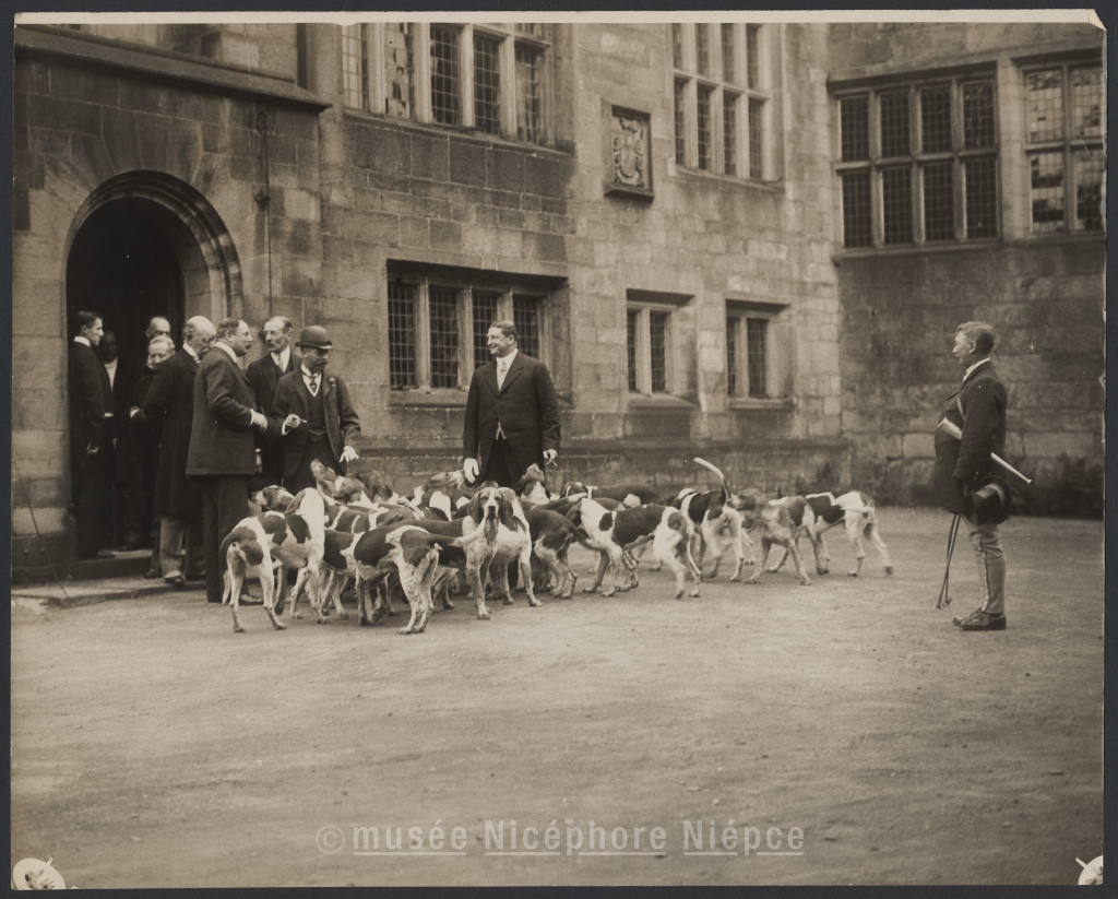 Le Roi d'Angleterre dans une cour de château avec une meute de chiens