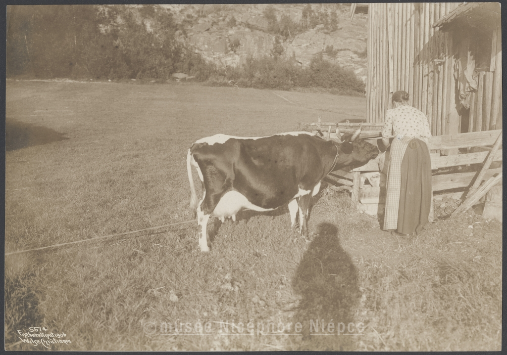 Paysanne norvégienne s'occupant de sa vache