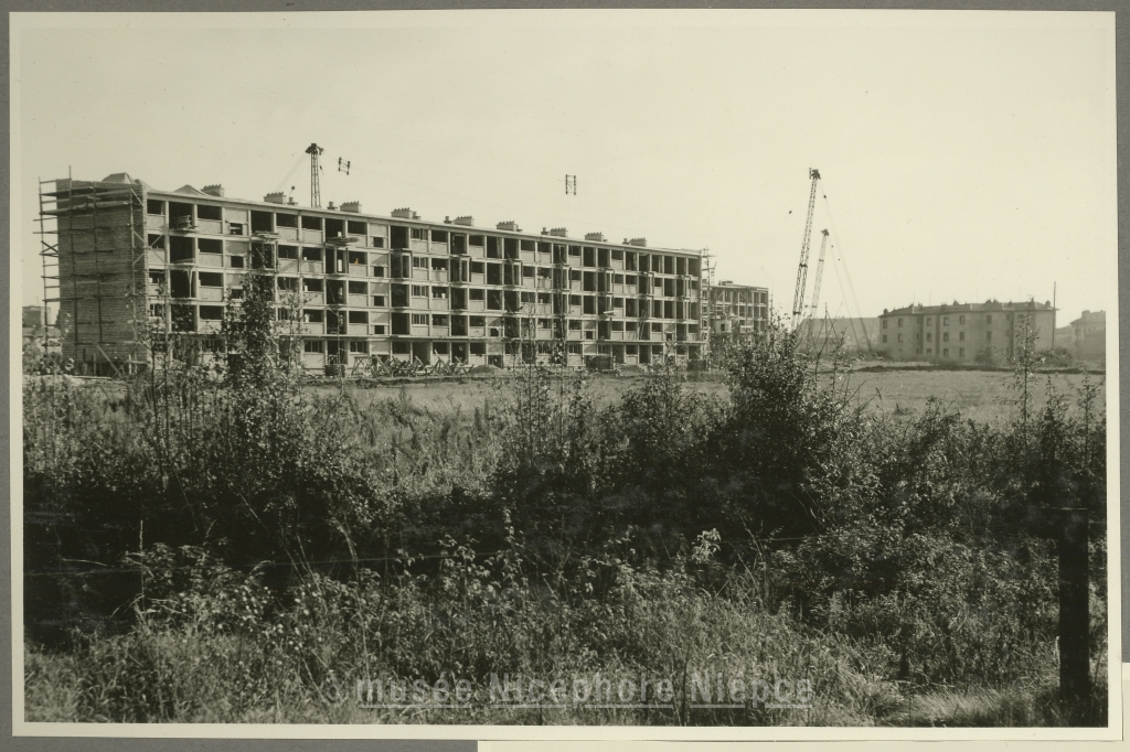 Nouveau quartier "Aubépin-Tuilerie" Les deux premiers immeubles, face à l'ouest Au 1er plan, la voie ferrée Chalon-Dole 15 Novembre 1954