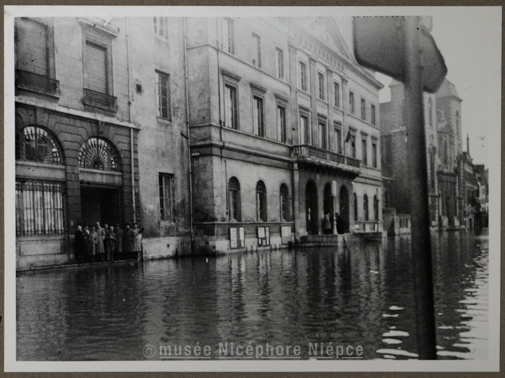 Inondations de Janvier 1955 Place de l'Hôtel de Ville : midi !... sortie des bureaux de la Sté Gros et Cie !