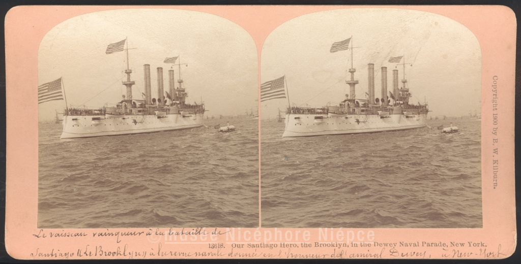 Le vaisseau vainqueur à la bataille de / Santiago Le Brooklyn à la revue navale donnée en l'honneur de l'amiral Dewey, à New-York