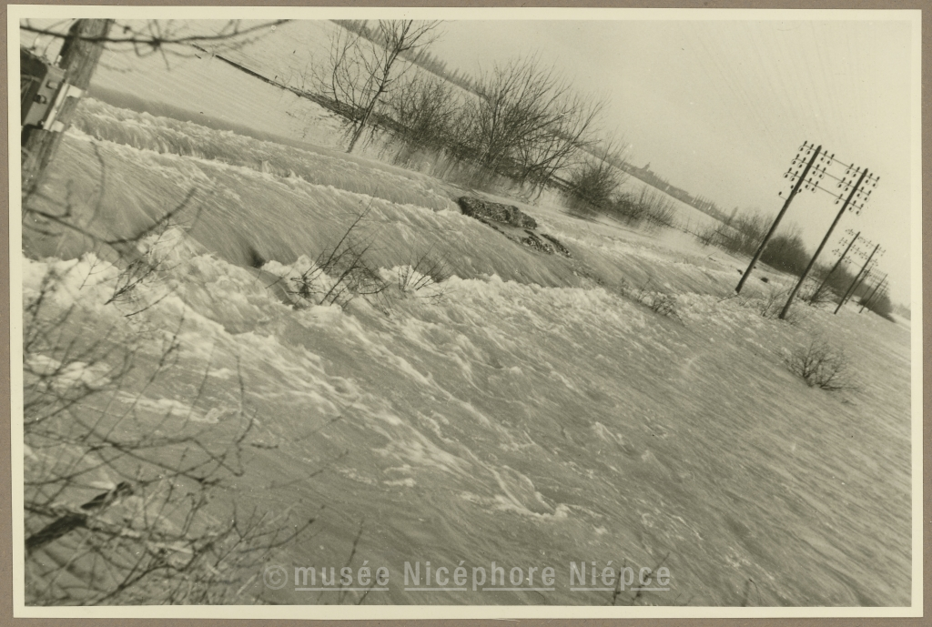Inondations de Janvier 1955 La voie ferrée submergée entre Chalon et St Marcel, aperçu dans le lointain