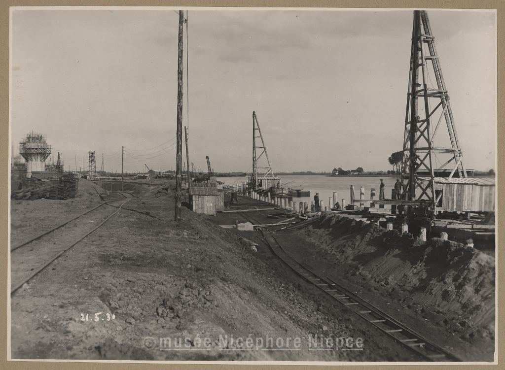 Vues des travaux de la Centrale thermique, au 21 mai 1930.-Petites inondations de mai 1930, avec la digue de la route endommagée. (cette digue fut édifiée en 1929 par la Sté "Formo-Centre") Les travaux de construction du débarcadère pour la Centrale thermique