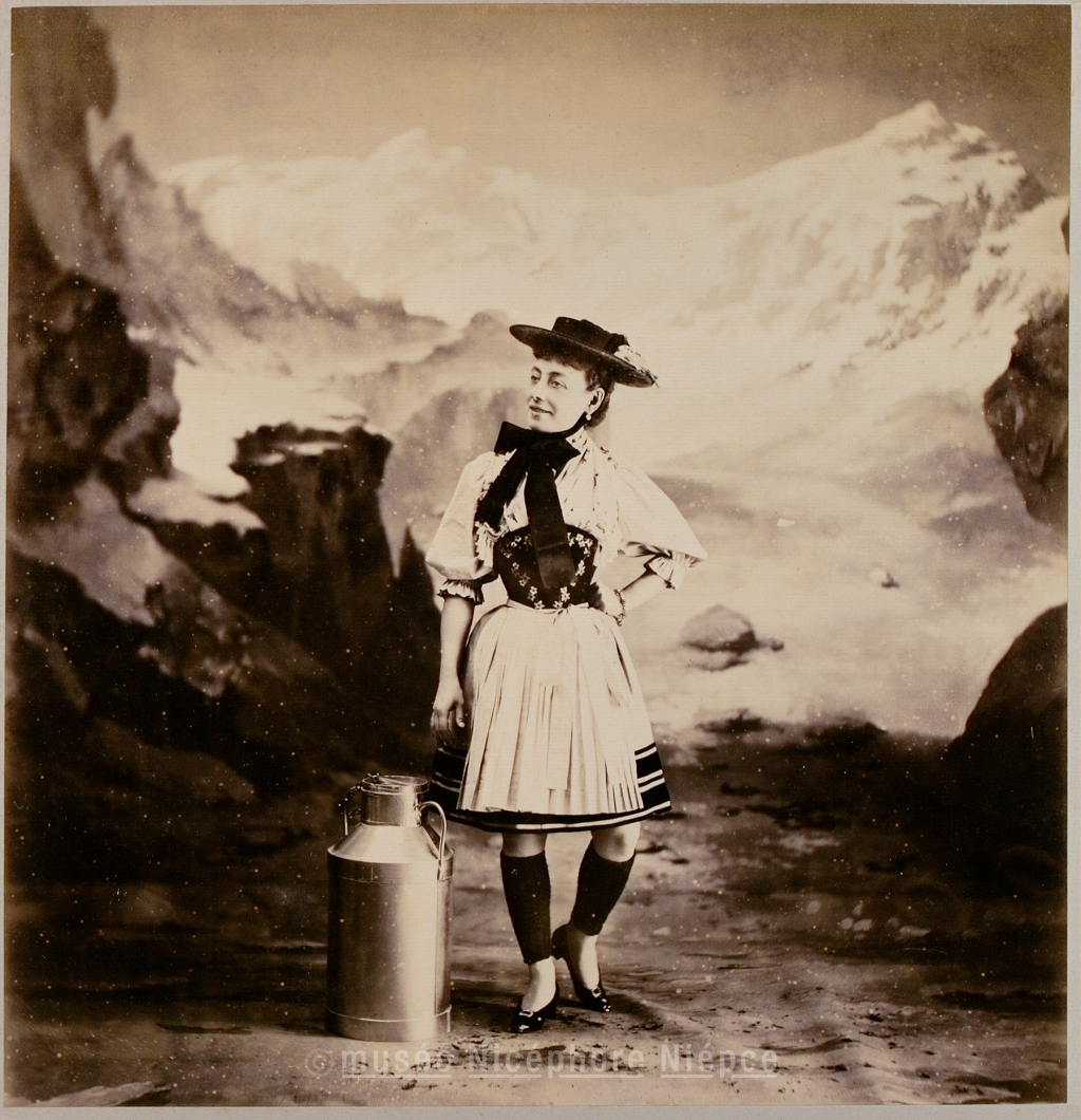 Jeune femme en costume tyrolien devant un décor