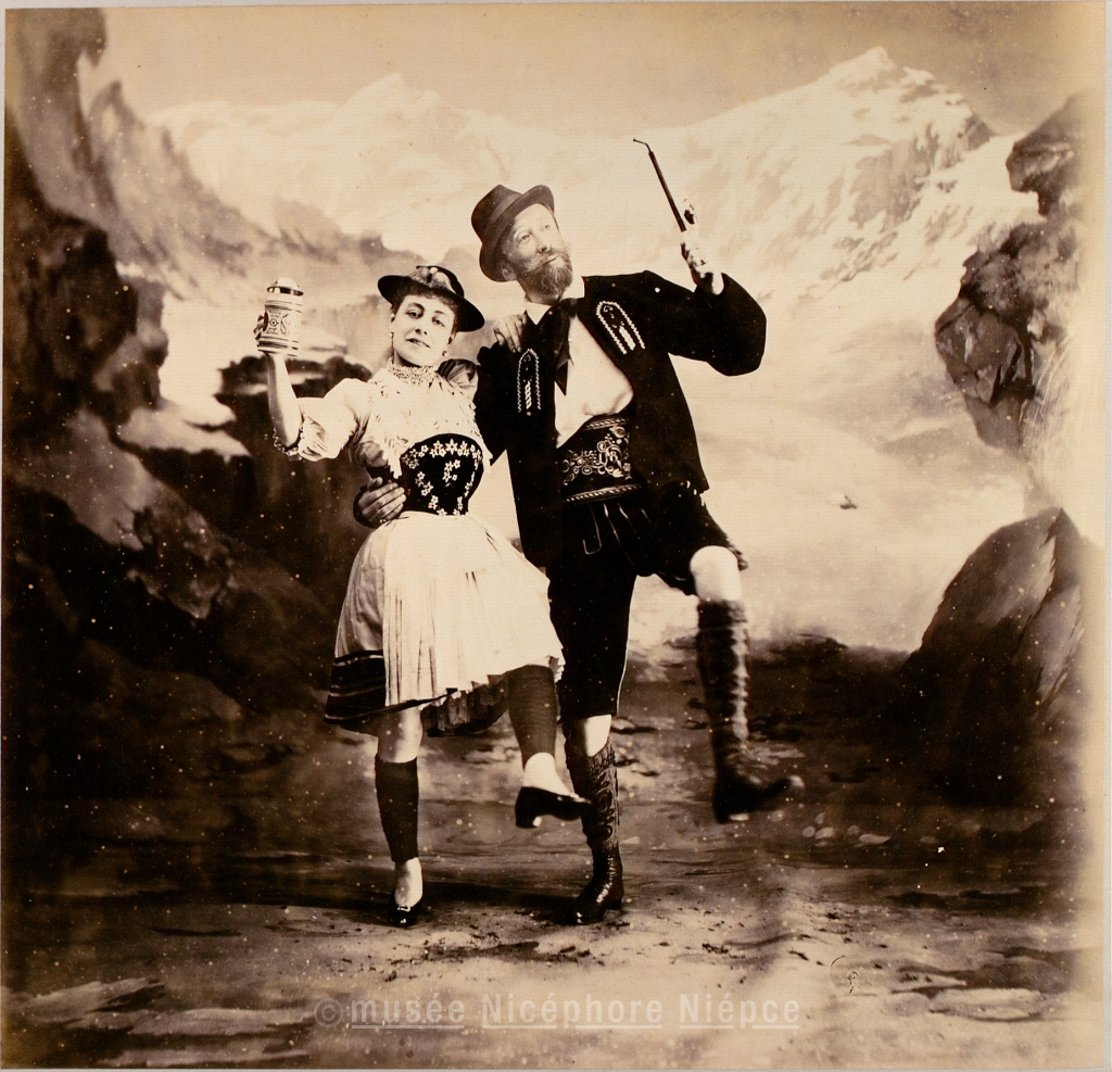 Benoît de Tyskiewicz en costume tyrolien avec une jeune femme devant un fond peint