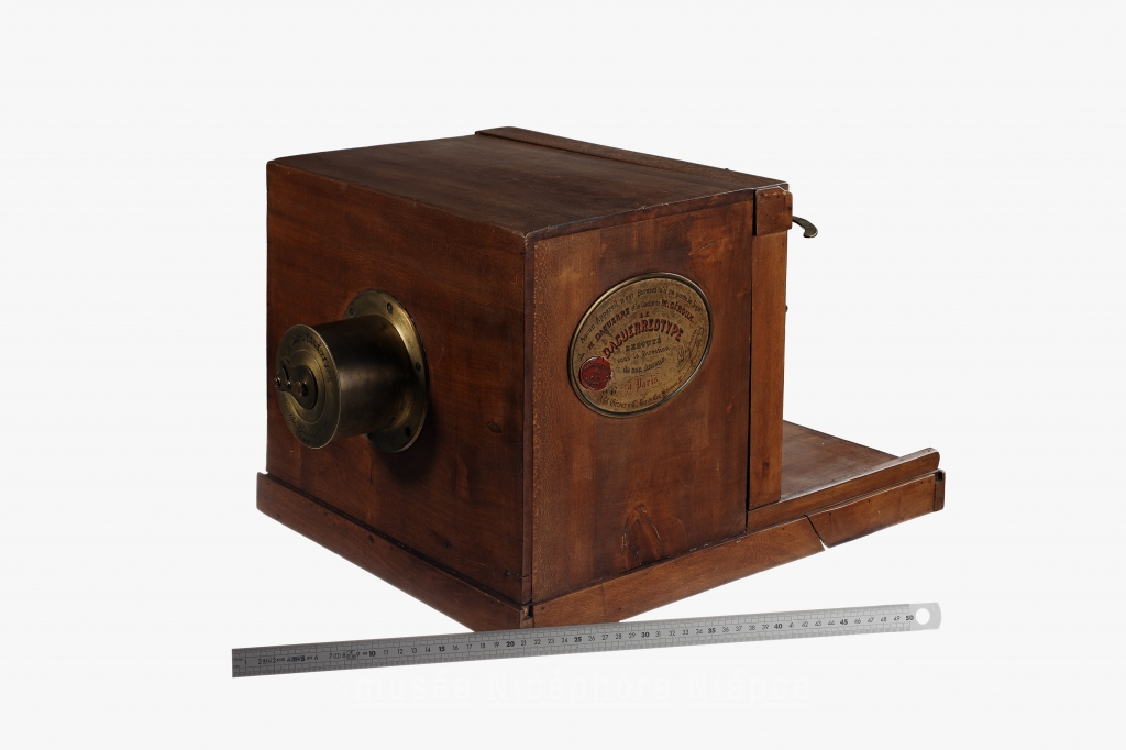 Le Daguerréotype, chambre à tiroir concue par Daguerre et vendue dès 1839. Premier appareil photographique commercialisé