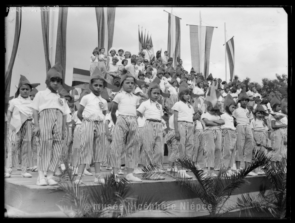 Groupe d'enfants en costume phrygiens sur une estrade