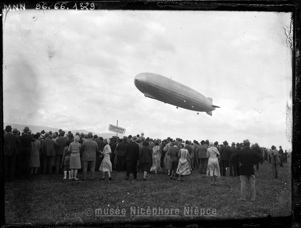 Foule assistant au vol d'un Zeppelin