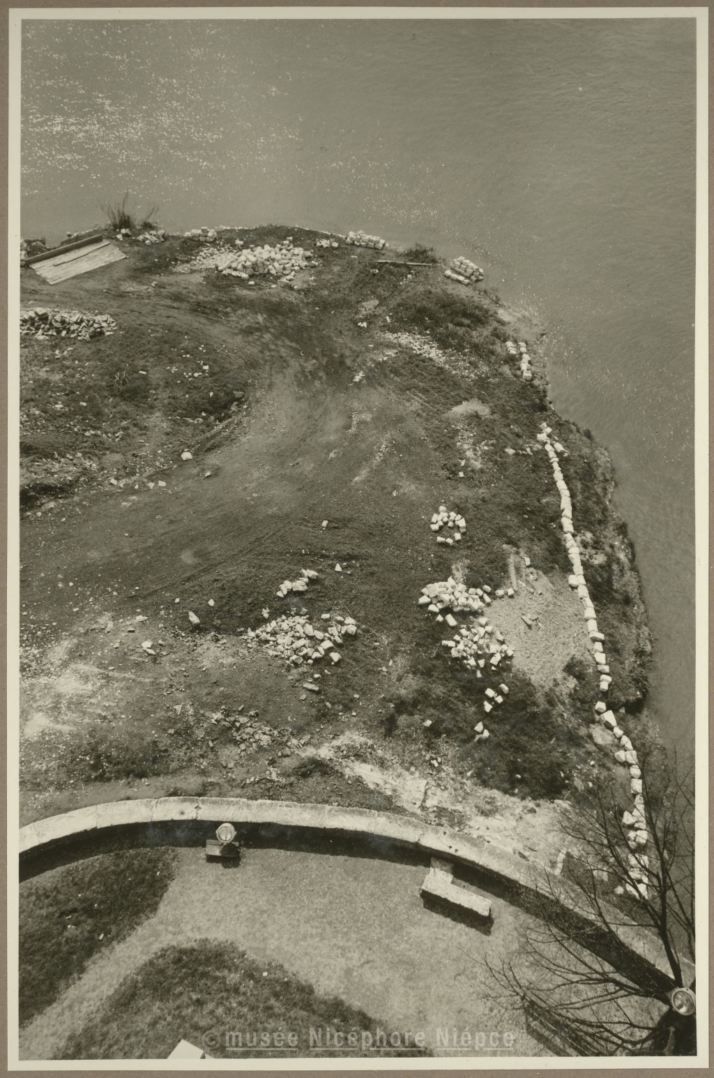 Vue plongeante - prise du haut de la tour du doyenné - sur la pointe de l'Ile St Laurent entre la Genise et la saône, avant son aménagement en jardin 17 Avril 1956