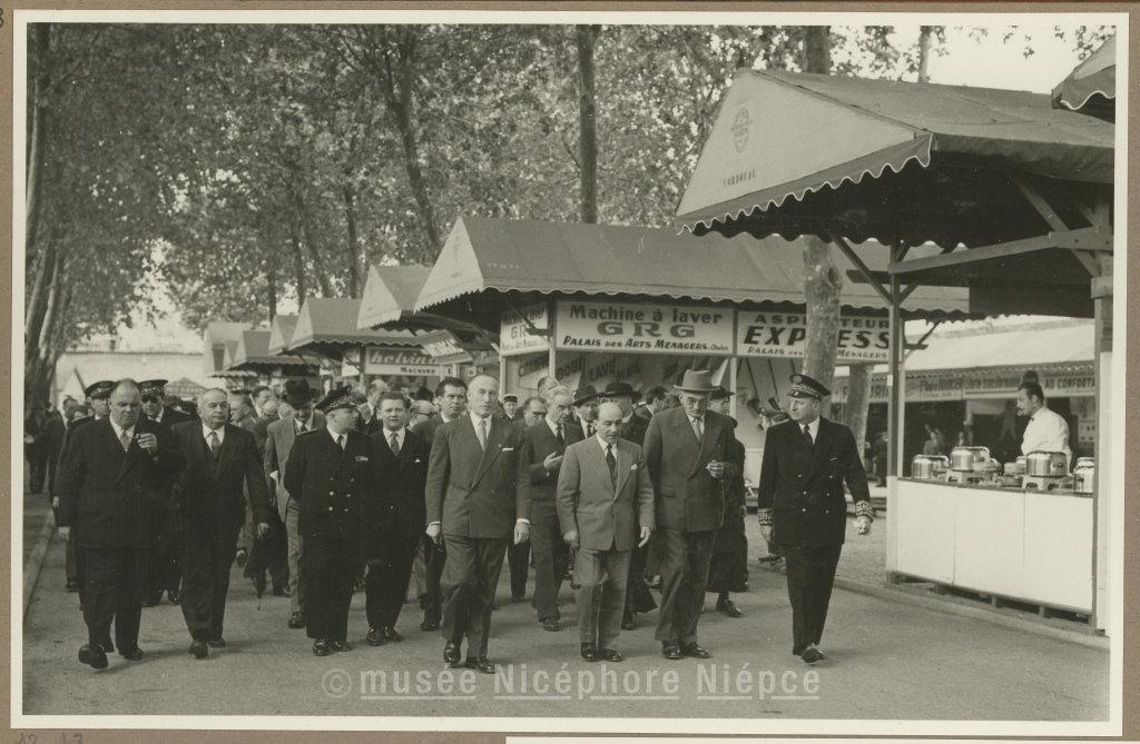 Le 24 Juin 1956, inauguration de la XXIIème Foire-Exposition, par M. Billières, Ministre de l'Education Nationale, accompagné de M. Vacher-Desvernais, délégué général du Centre National du Commerce extérieur au Ministère des Affaires Etrangères, et de M. le Préfet Chopin