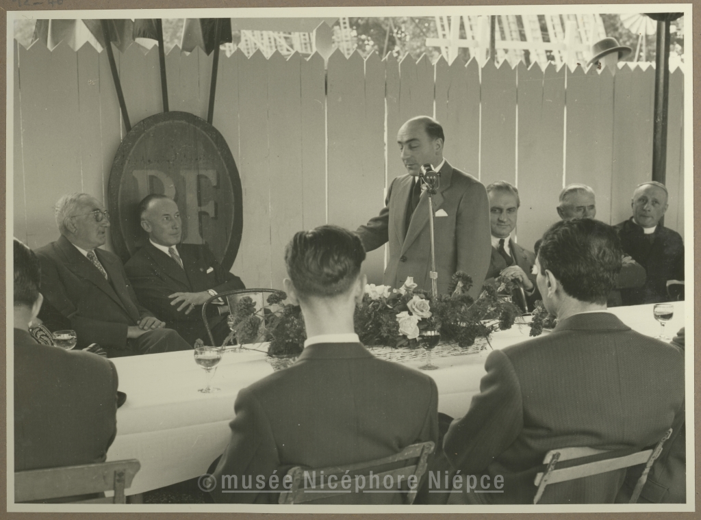 Le 24 Juin 1956, inauguration de la XXIIème Foire-Exposition, par M. Billières, Ministre de l'Education Nationale, accompagné de M. Vacher-Desvernais, délégué général du Centre National du Commerce extérieur au Ministère des Affaires Etrangères, et de M. le Préfet Chopin