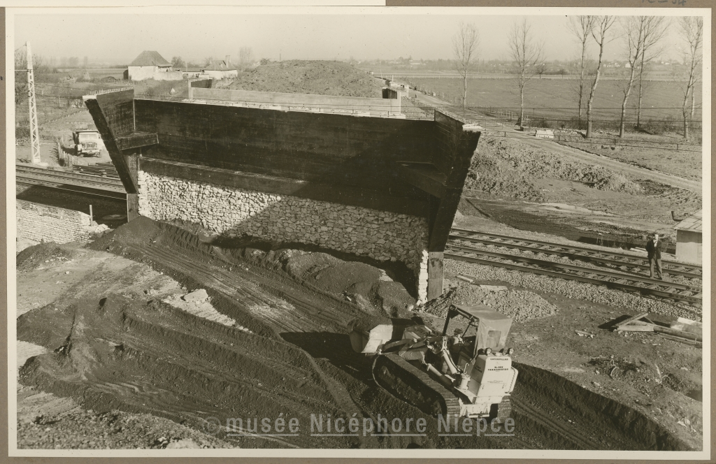 Travaux du pont de la déviation de la route Nle 6, au dessus de la voie ferrée, à hauteur de Corcelles en direction du Nord 3 Janvier 1957