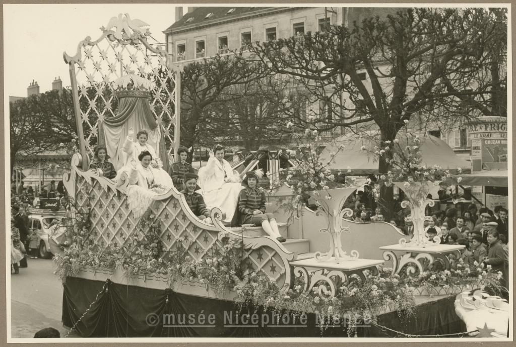 Le char fleuri des reines du Travail Melles lucette Noëls, Astrid Boisfard et monique Bruandet 5 Mars 1957