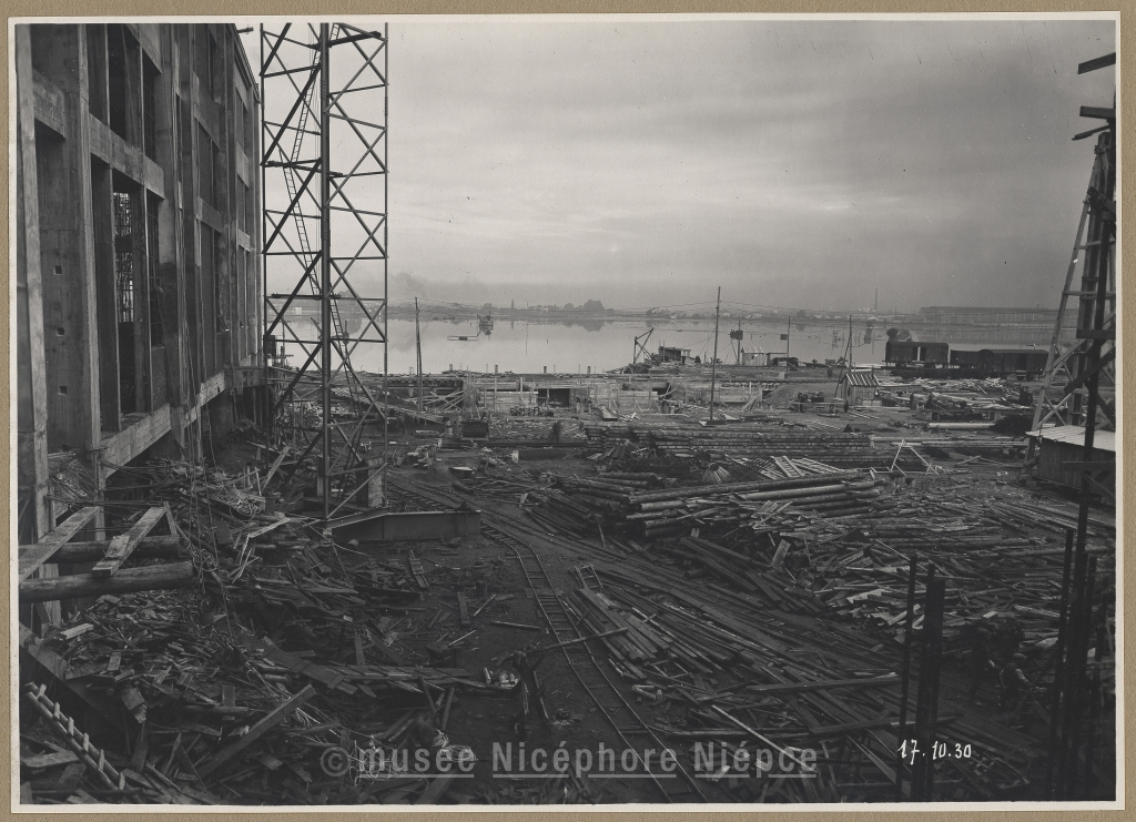 Chantiers de la "Centrale thermique" : au second plan, inondations de la saône ; dans le lointain : St Rémy et les ateliers Schneider et Cie
