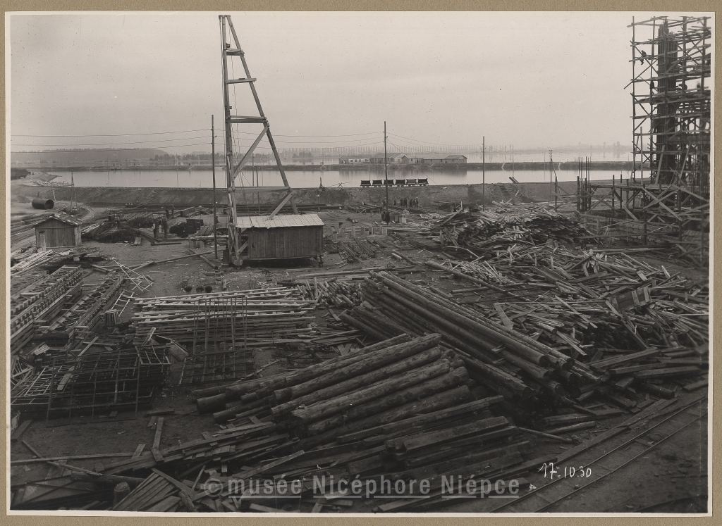 Chantiers de la "Centrale thermique : au second plan, inondations de la saône ; - dans le lointain : à gauche, quartier St Laurent ; à droite, St Marcel-les-Chalon