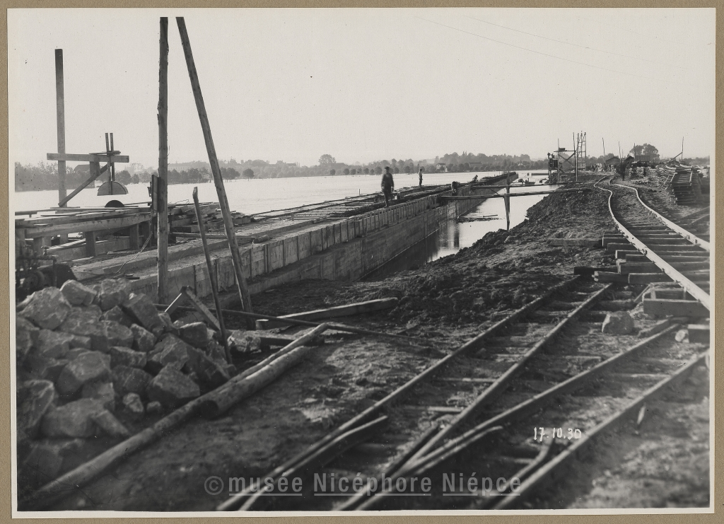 Chantiers de la "Centrale thermique" : au second plan, la Saône en crue ;-dans le lointain : St Rémy