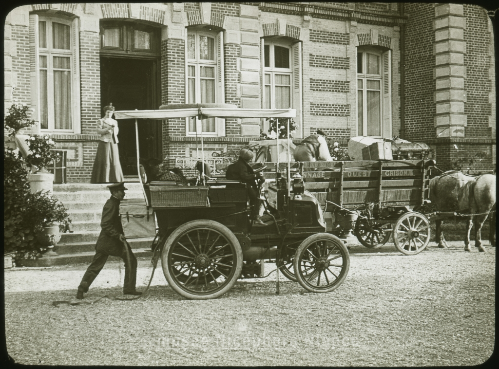 Chargement de l'automobile devant l'entrée du château de San Carlo