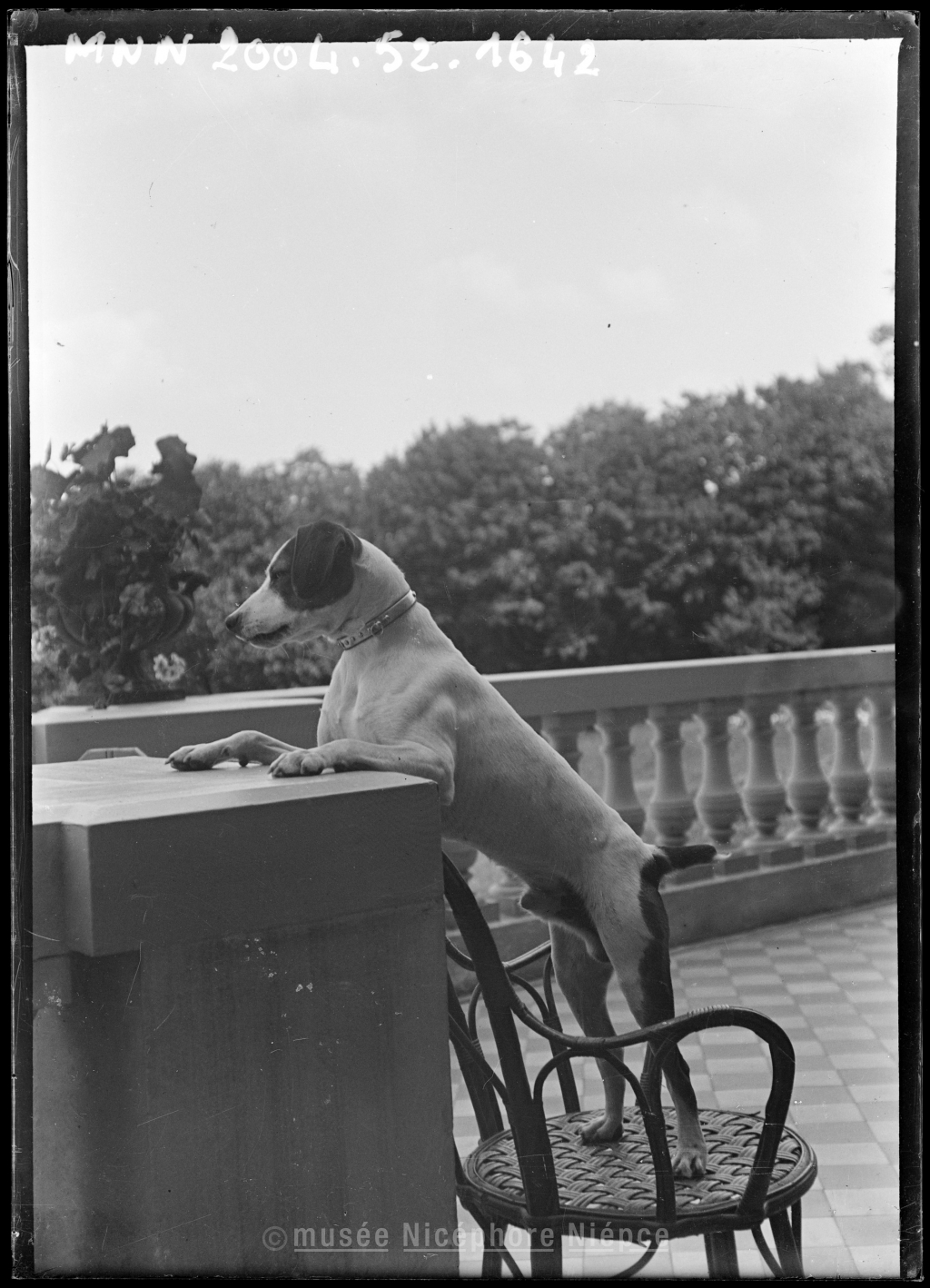 Chien observant le parc depuis la grande terrasse du château