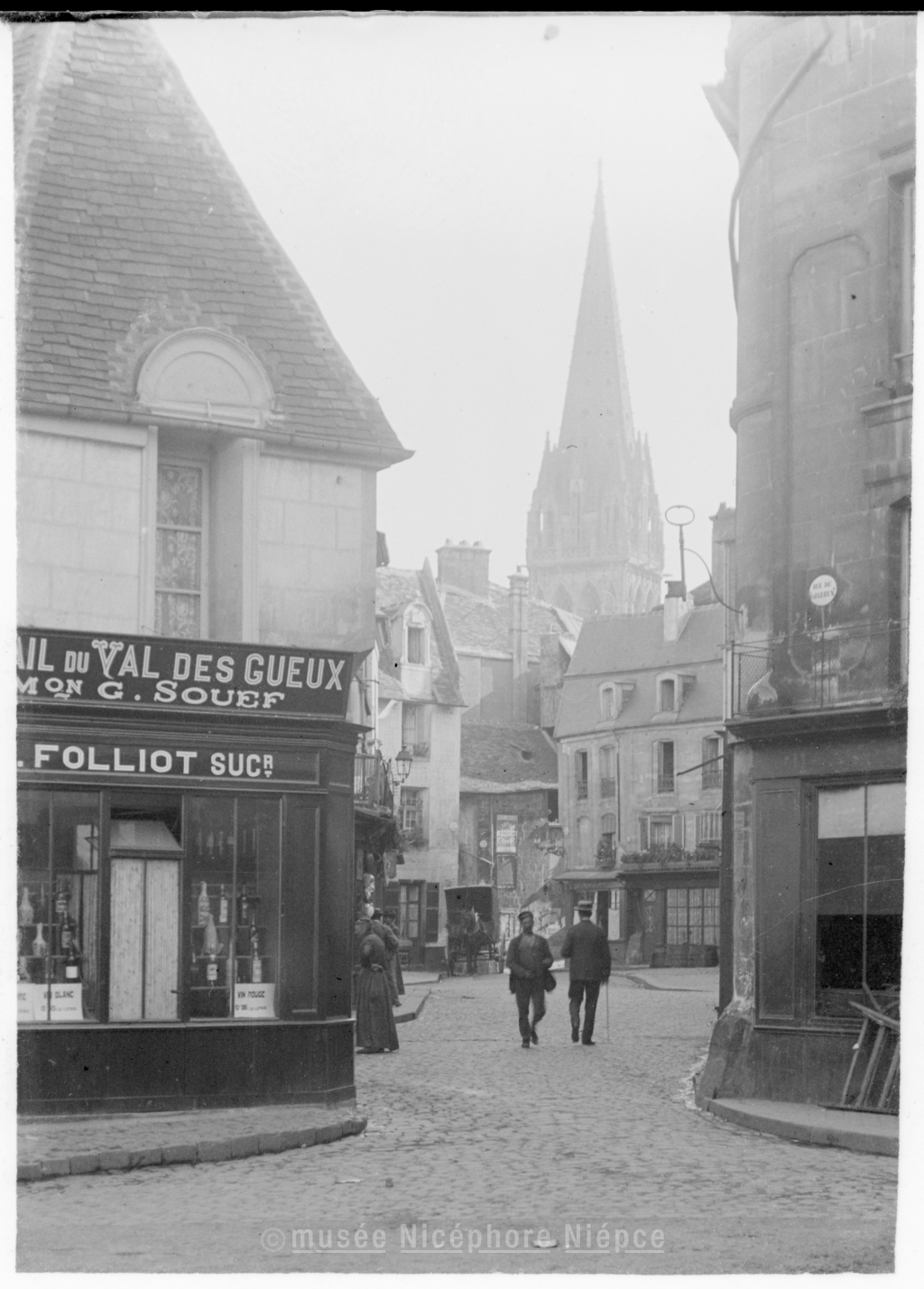 Le clocher de l'église Saint-Pierre vu depuis la rue du Vaugueux à Caen