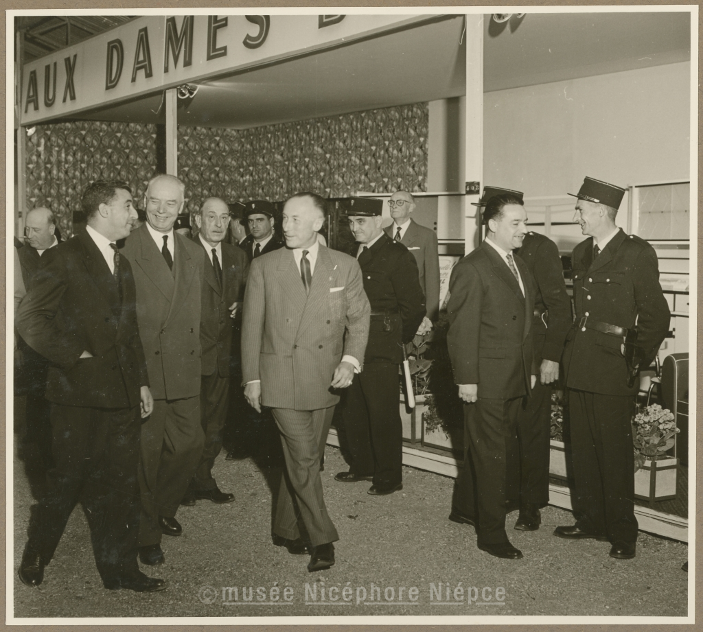 XXIVè Foire-Exposition Présentation de l'exposition départementale des "Meilleurs Ouvriers de France" à M. Arrighi de Casanova par M. Buisson, Directeur de l'enseignement Technique, assisté de M. Just et de M. Assémat 22 juin 1958