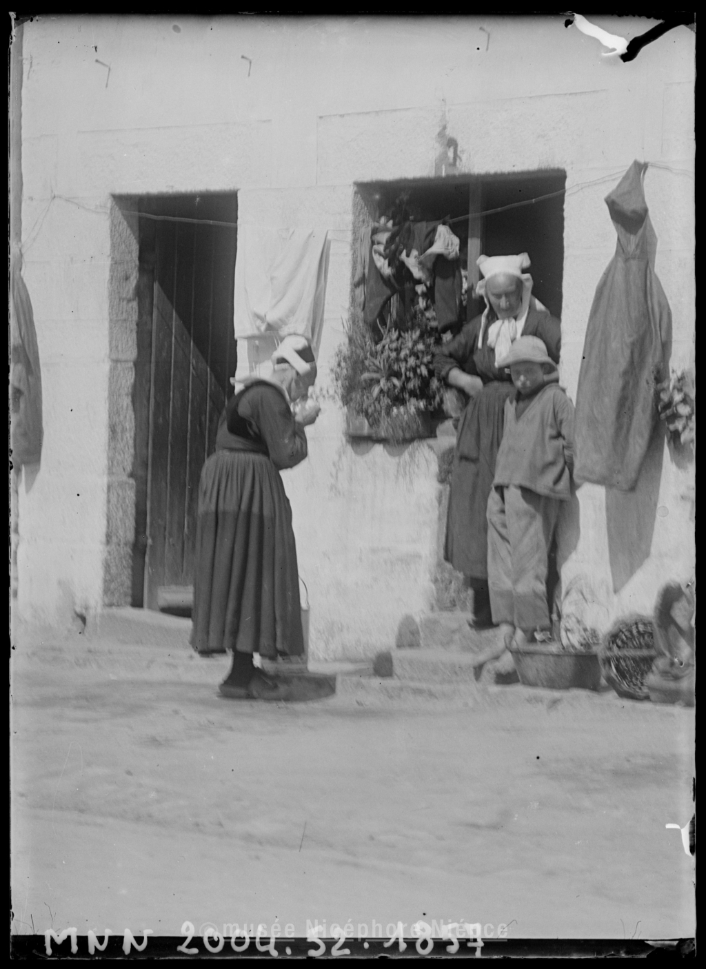Deux femmes et un jeune garçon sur le pas d'une porte en Bretagne