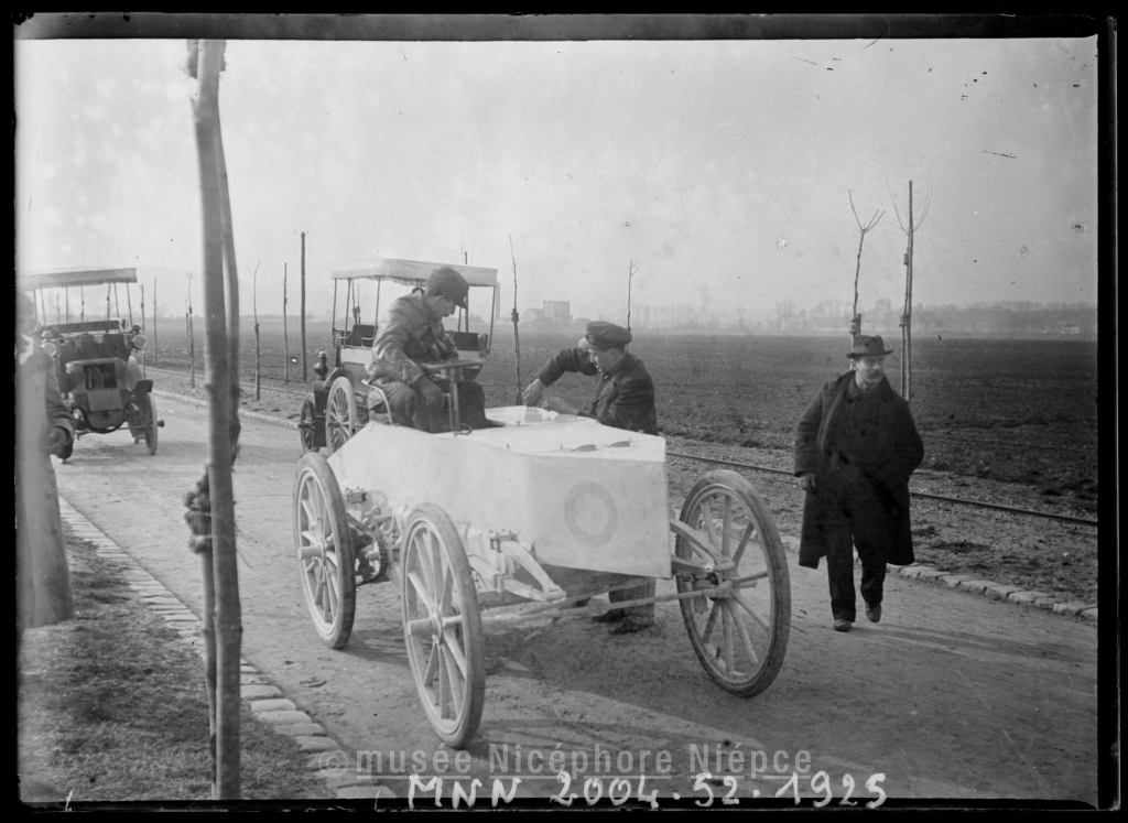 Le Comte Gaston de Chasseloup-Laubat sur sa Jeantaud à Achères avant la course (record de vitesse absolue sur 1 km)