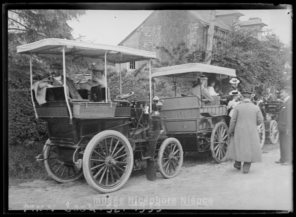 Automobiles garées le long d'une route à loccasion d'une course (la femme assise dans celle de gauche est Mme Demachy)