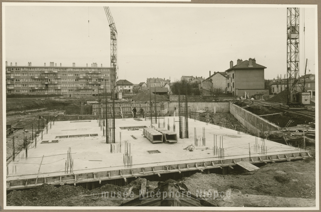 Construction du Centre Commercial de l'Aubépin : plate-forme de la tour, et fondations du garage et des boutiques 4 Mars 1959