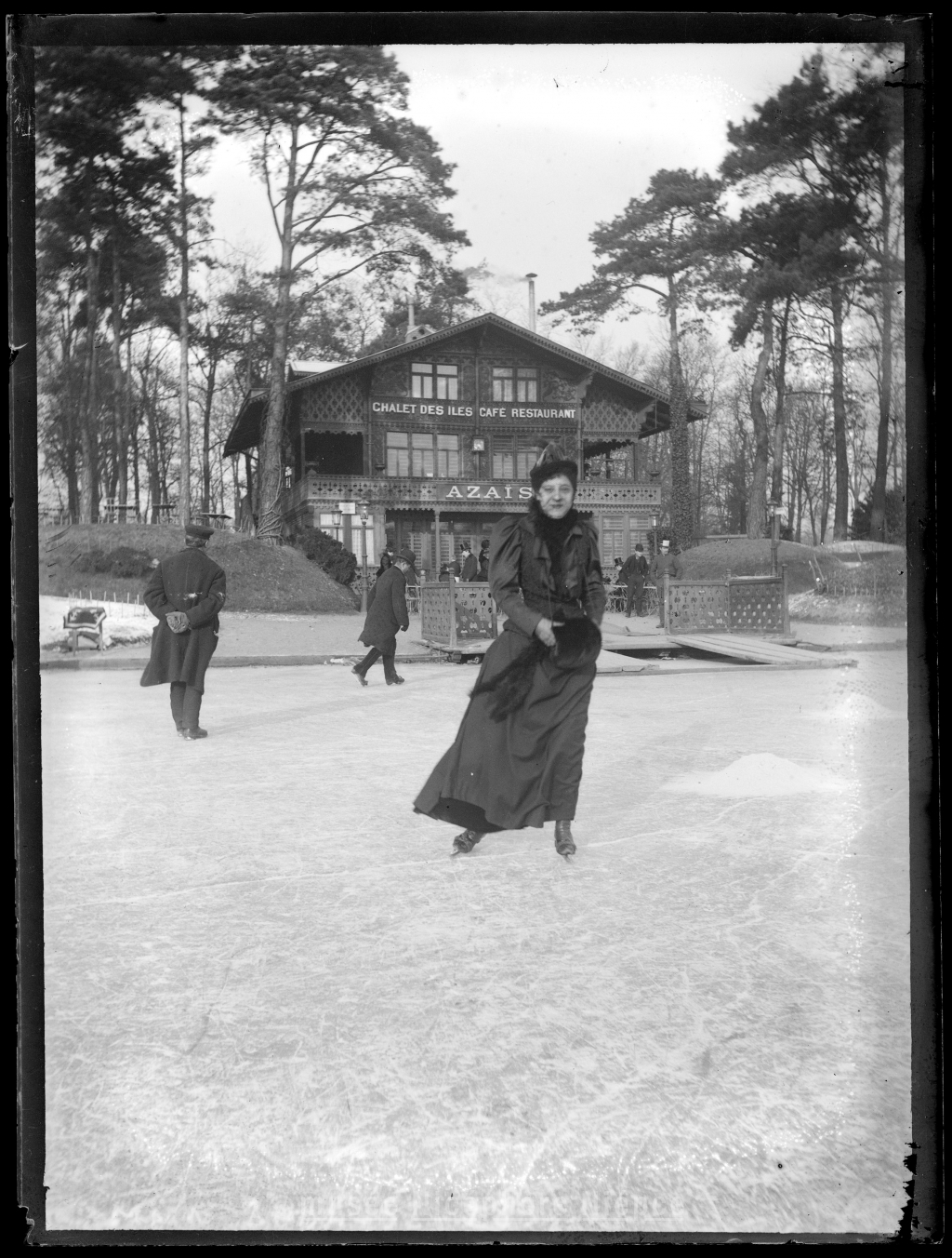 Patineuse devant le restaurant « Le Chalet des îles » (ouvert en 1880)