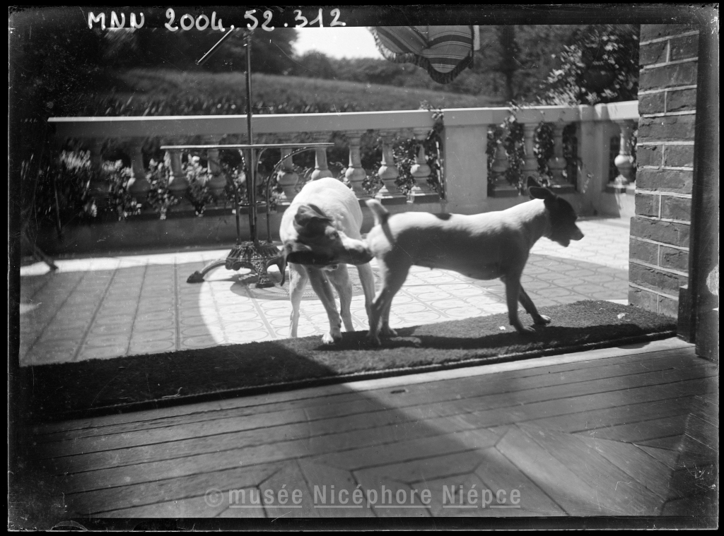 Deux chiens sur la terrasse vus depuis lintérieur du château