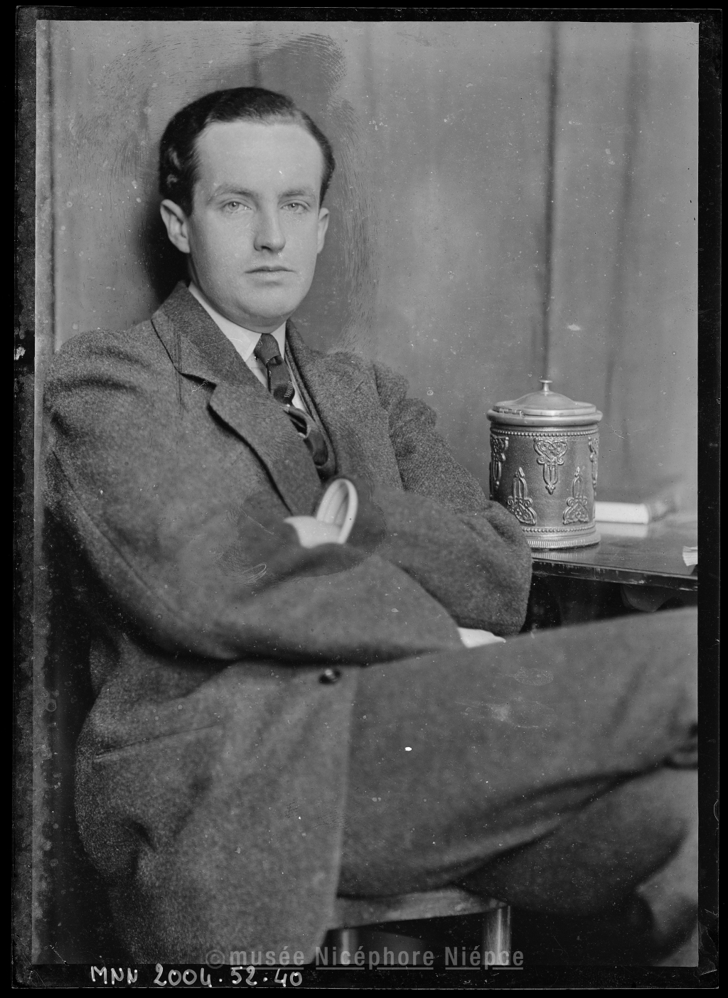 Bob assis, en costume sombre, dans l'atelier
