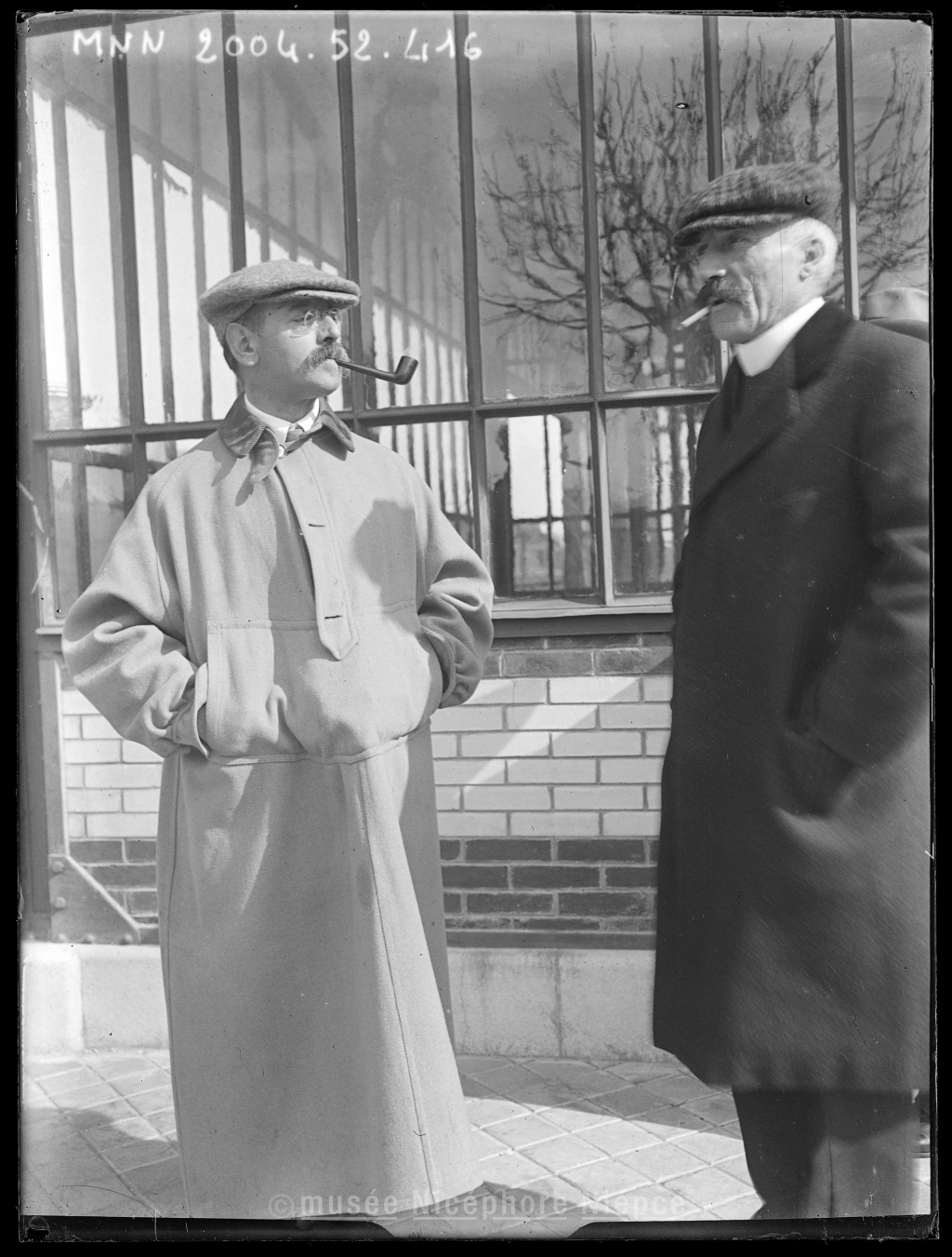 Deux hommes (dont M. Homère ?) devant un bâtiment vitré