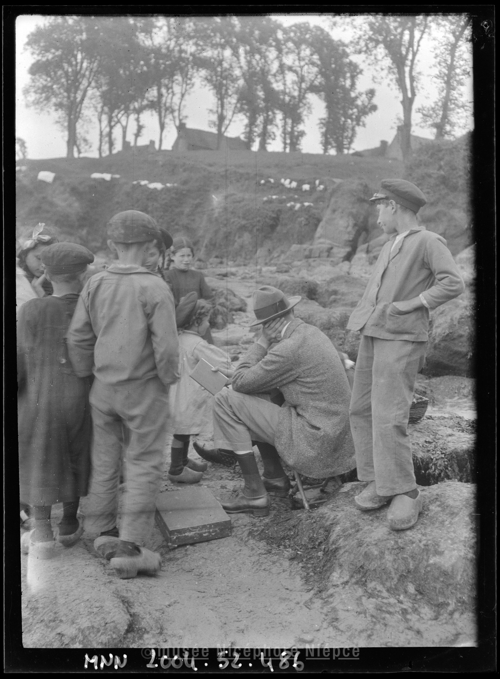 Enfants autour d un peintre (M. Homère ?) en contrebas des Plomarc'h
