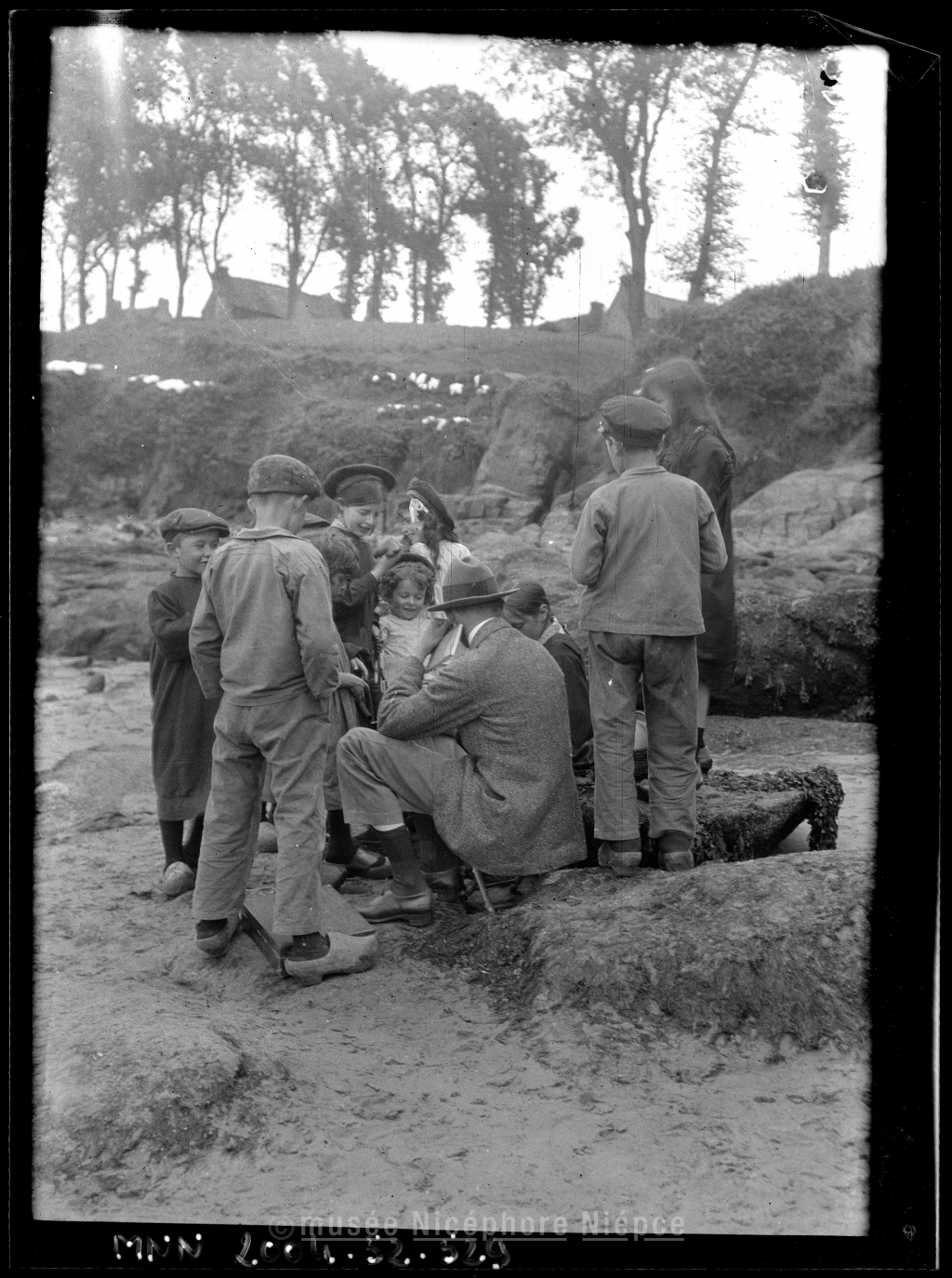 Peintre (M. Homère ?) entouré d'enfants en contrebas des Plomarc'h