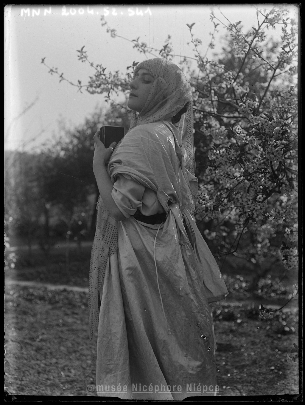 Modèle féminin voilé auprès d'un arbre en fleurs