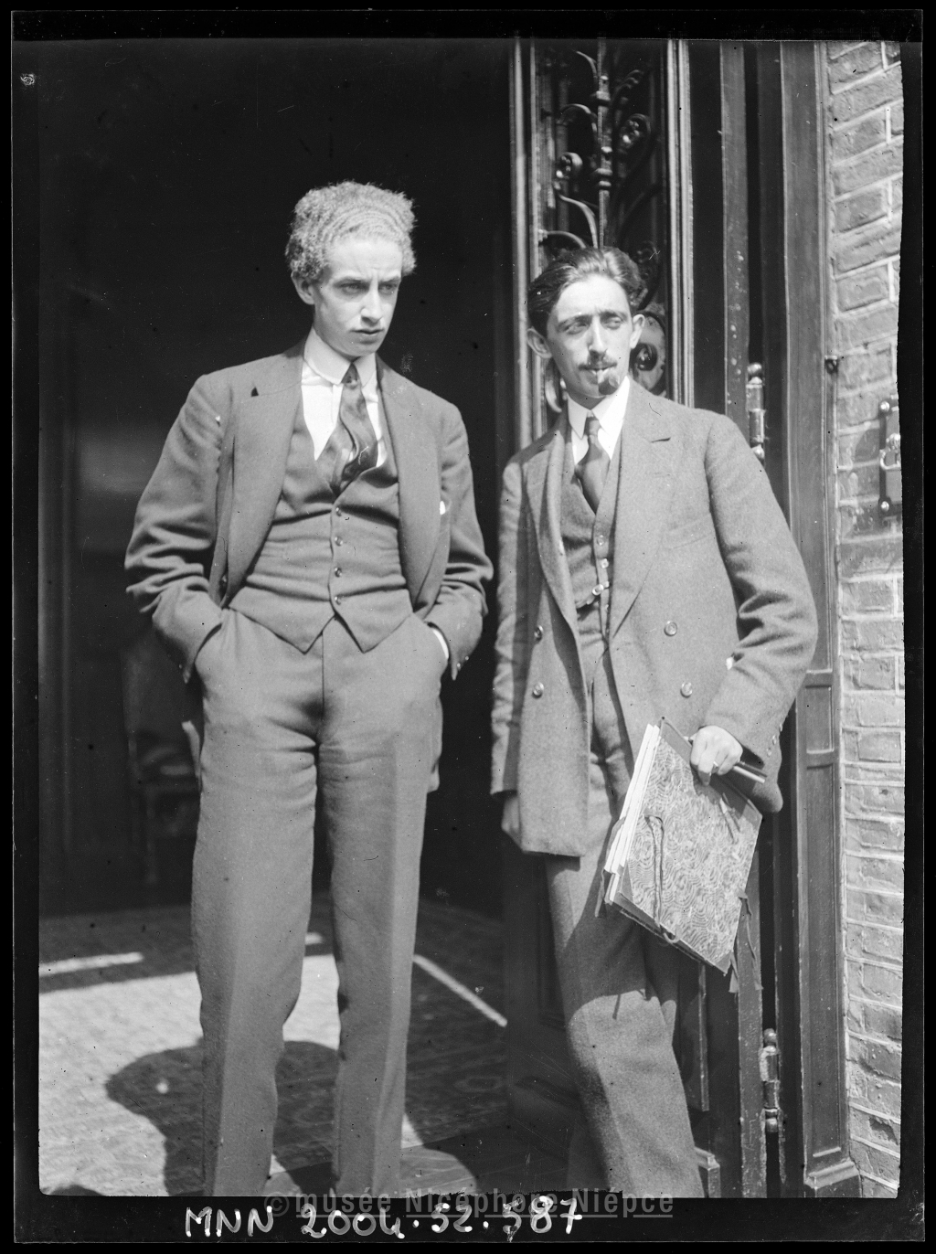Deux hommes posant devant la porte d'entrée du château